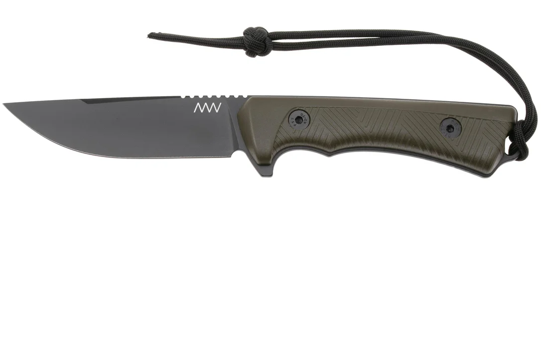 La hoja del ANV P200, P200-047, Black Cerakote Sleipner, Olive GRNPU, cuchillo de supervivencia mide 10 cm de longitud y 3,5 mm de grosor. La longitud total es de 23,5 cm.