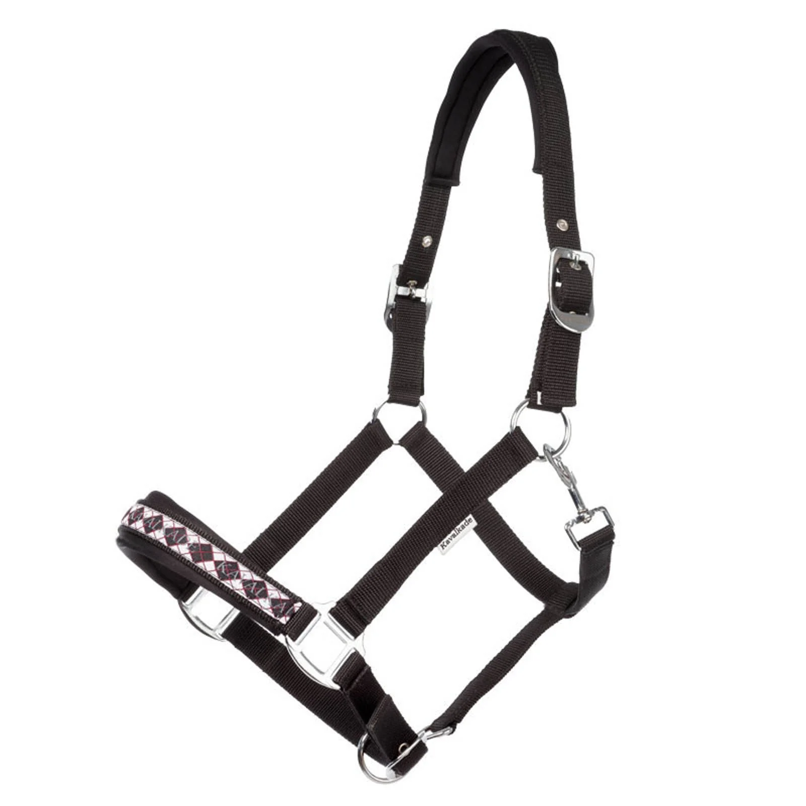La muserola con diseño de cuadros tiene un color a juego y está acolchada. El cuello y la nariz están suavemente acolchados. El halter es ajustable en ambos lados.