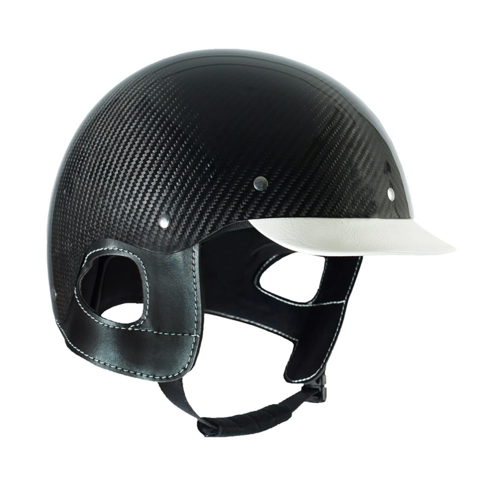 Casco de trote superligero fabricado en fibra de carbono, con visera de cuero y orejeras de cuero. Contiene forro extraíble hecho de material Cool max que es fácil de limpiar. Cumple con los requisitos CE VG1. 575gXS-54, S-56, M-58, L-60, XL-62, XXL-64