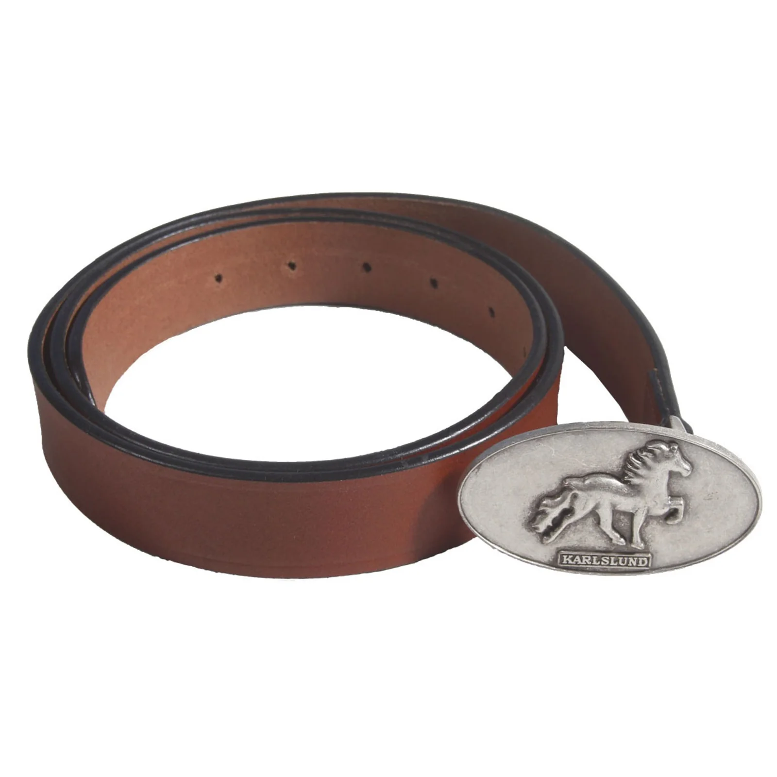 Bonito cinturón en piel de buena calidad con un bonito diseño rústico de caballo islandés en la hebilla. Se adapta a los pantalones Karlslund.