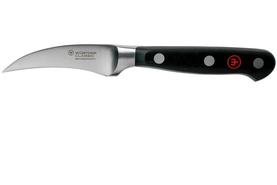 Este cuchillo pelador Wüsthof Classic también se llama cuchillo curvo. El torneado es una técnica de corte. La palabra viene del francés «tourner», que significa giro. Esta técnica se utiliza principalmente para dar a las piezas de un producto la misma forma. Por ejemplo, para conseguir una buena presentación o incluso resultados de cocción. Para estas tareas, un cuchillo curvo es la respuesta. Incluso las tareas más pequeñas son pan comido para este cuchillo pelador de la colección Classic. Este cuchillo no pesa casi nada y está perfectamente equilibrado. Por ello, el cuchillo se siente muy bien en la mano.