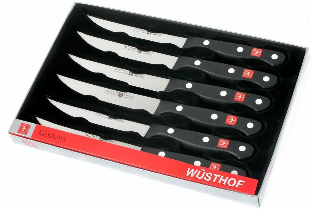 WÜSTHOF tiene una fantástica relación calidad-precio con su colección Gourmet. Los cuchillos tienen la misma alta calidad que caracteriza a WÜSTHOF. La hoja está cortada con un láser de una sola pieza de acero (cromo-molibdeno-vanadio). El mango de polipropileno está unido a la hoja con remaches bien sujetos. La hoja recorre todo el mango. El resultado es un cuchillo que se parece mucho a los cuchillos de la colección Wusthof Classic. Pero debido al método de producción, los cuchillos Gourmet son considerablemente más baratos. Muchos usuarios consideran que el menor peso también es una ventaja. La colección Gourmet es muy completa, por lo que cualquier persona puede reunir su juego de cuchillos ideal.