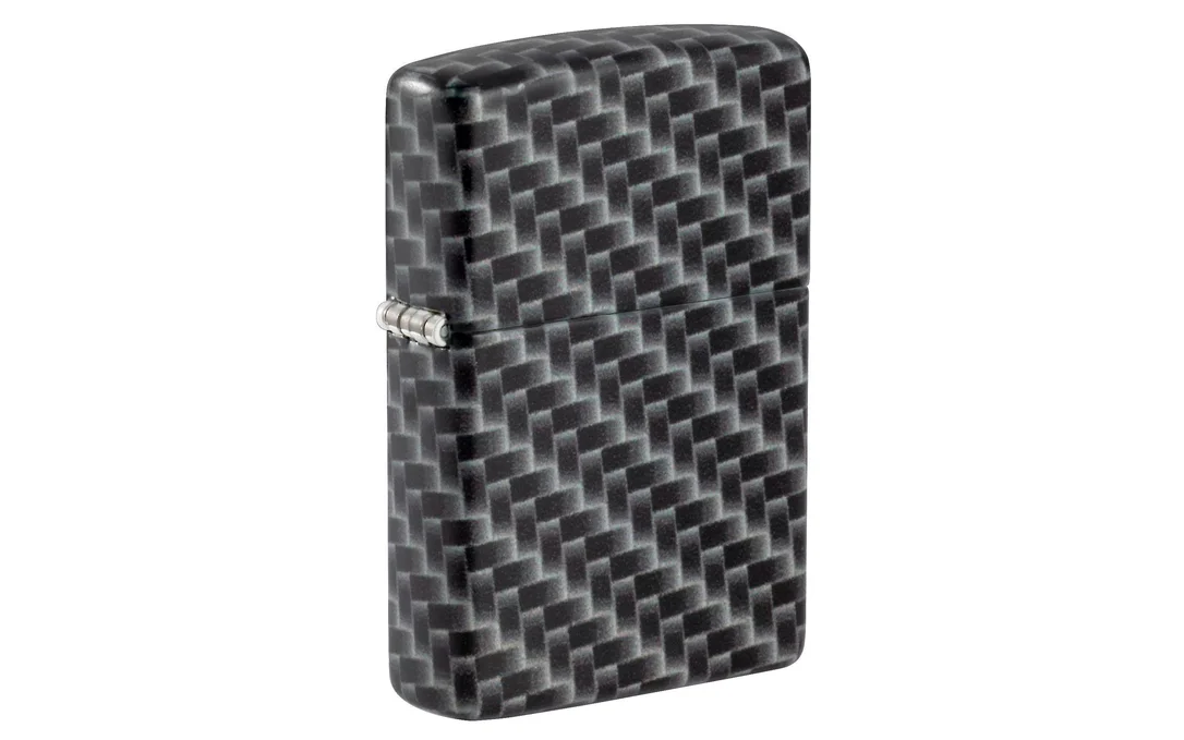 Este mechero Zippo de color negro mate está mejorado con un diseño de fibra de carbono. Esta nueva forma de decorar el Zippo hace que todo el encendedor quede embellecido con el diseño. El sello en la parte inferior y la bisagra están grabados con un láser para asegurarse de que el Zippo funciona perfectamente.