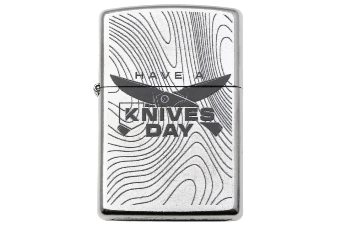 Este encendedor Zippo Street Chrome Knivesandtools HAKD-exclusive tiene un acabado cromado muy brillante con el logotipo grabado a láser del Have a Knives Day de Knivesandtools.